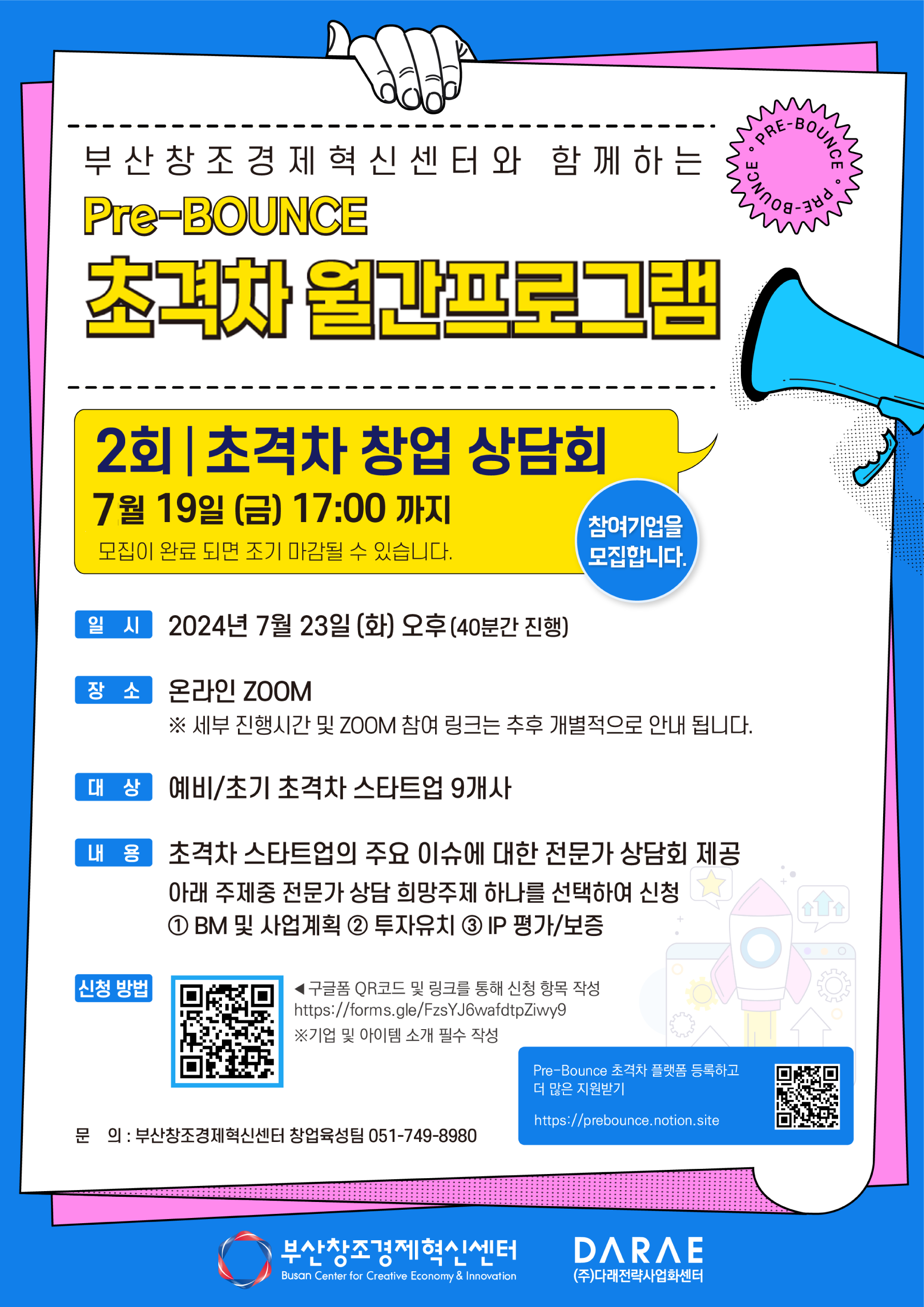 이번 온라인 상담회는 부산창조경제혁신센터 Pre-Bounce 플랫폼에 가입한 예비/초기 단계의 스타트업을 대상으로 1) 비즈니스 모델 및 사업계획, 2) 투자 유치, 3) 지적 재산 기반의 보증 평가 등 심층 상담이 진행되는데요.