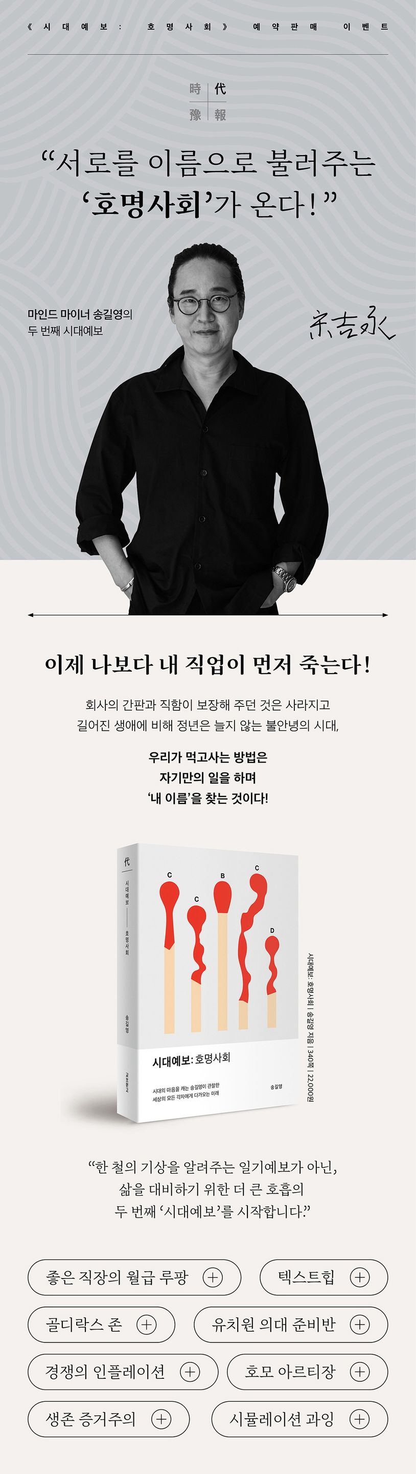 이번 <시대예보 : 호명사회>에서는 경쟁의 인플레이션, 시뮬레이션 과잉, 좋은 직장의 월급 루팡, 유치원 의대 준비반, 열정의 가치 폭락, 가해자 세대와 피해자 세대 등 요즘의 불안녕 시대를 다루고 있습니다. 또 없어지지 않을 직업들, 생존 증거주의, 골디락스 존, N잡러, 느슨한 연대감, 텍스트힙, 호모 아르티장 등 앞으로 우리가 맞이할 키워드에 대해서도 설명을 하고 있는데요.